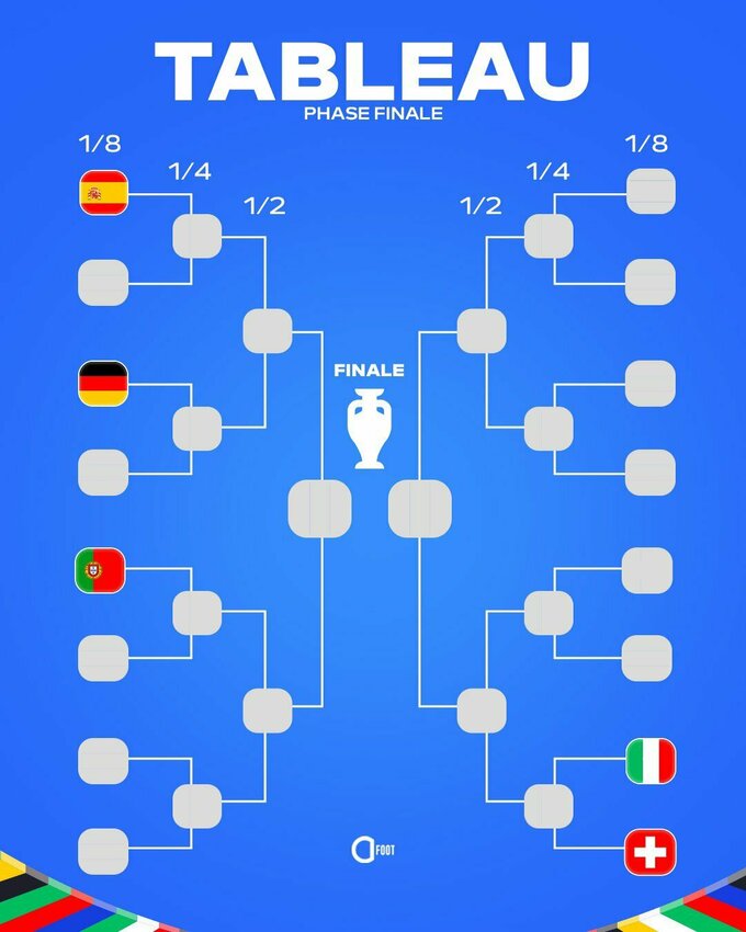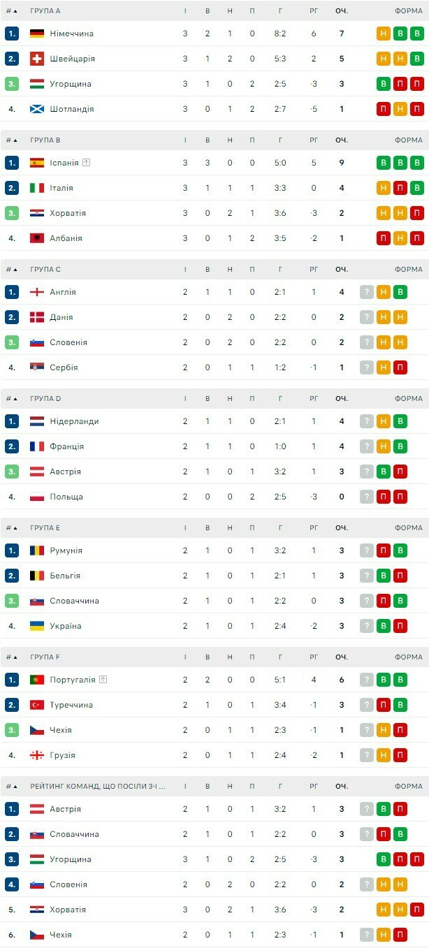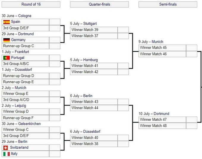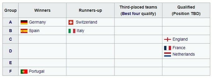 Путевки в 1/8 финала имеют 8 сборных – Испания, Германия, Португалия, Италия, Швейцария, Англия, Франция, Нидерланды.