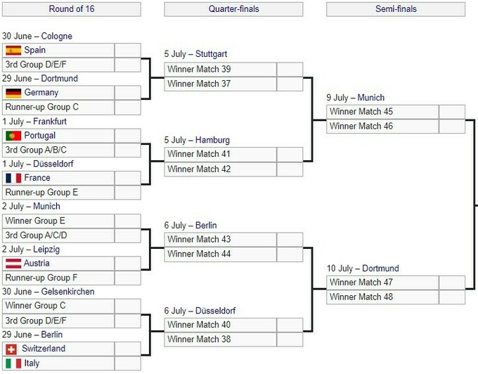Соперники всех трех команд в 1/8 финала будут определены позже, однако уже известно, что Испания, Германия, Португалия и Франция попали в верхнюю часть сетку плей-офф и могут встретиться между собой еще до финала.