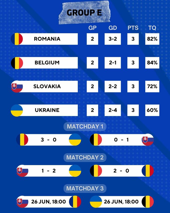 В последнем туре 26 июня Украина сыграет против Бельгии, а в другом поединке встретятся Словакия и Румыния.