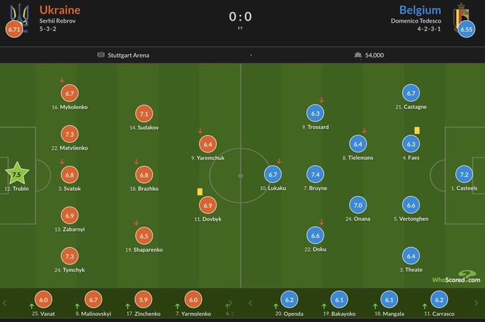 У бельгийцев самые высокие баллы получили Де Брюйне (7.4), Кастелс (7.2) и Онана (7.0).