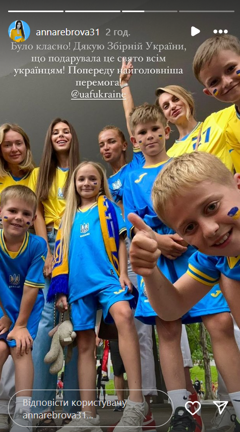 Анна Реброва, жена главного тренера национальной сборной Украины по футболу Сергея Реброва, в своем Instagram поблагодарила «сине-желтых» за выступление на чемпионате Европы 2024 года, проходящем в Германии: