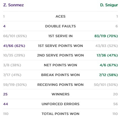 Доречі, в обох програних партіях турка нагадувала кролика перед удавом. У 4 із 5 останніх геймів: 11, 12 у 2-му сеті й 10, 12 у 3-му, Сонмез взяла аж ... 2 м'ячі. Трішки вперлася в передостанньому 3 сета (10 розіграшів), але теж жодного разу не лідирувала, тільки наздоганяла. Врешті не наздогнала і віддала останній на своїй подачі під 0.