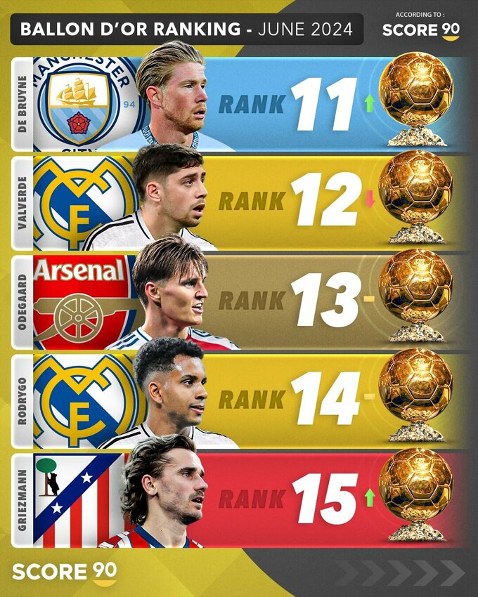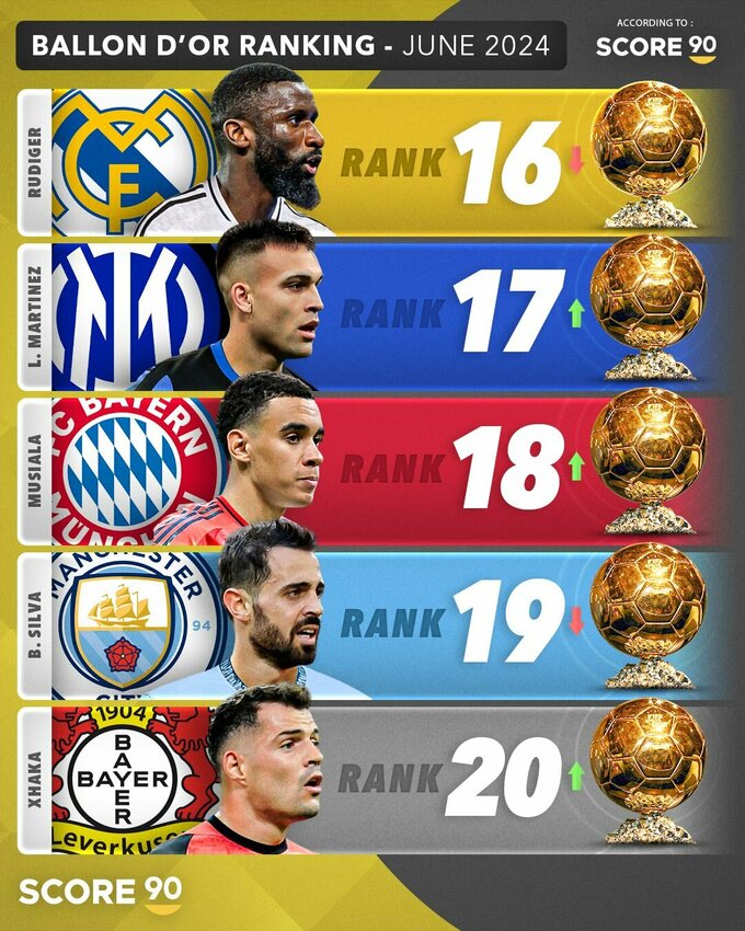 Авторитетный портал Score 90 обнародовал обновленный рейтинг главных претендентов на Золотой мяч 2024 после завершения группового этапа Евро-2024.