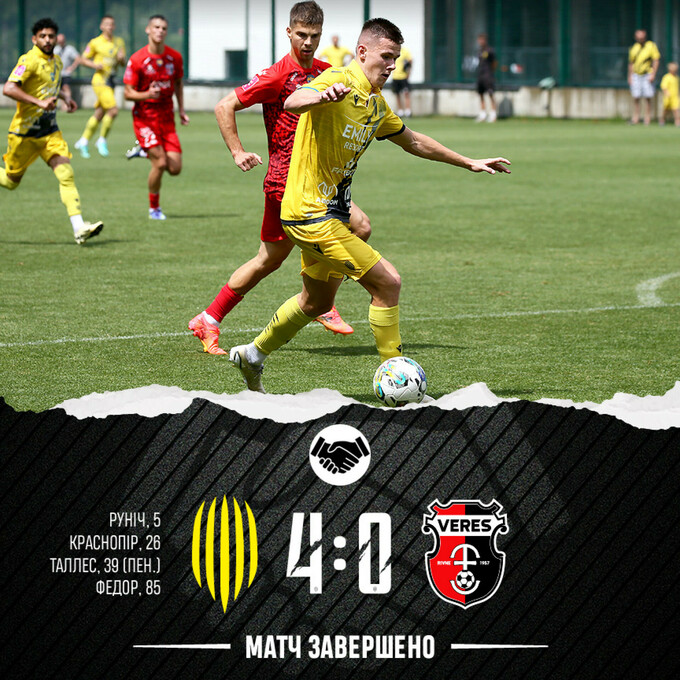«Верес» (2 тайм): Ющишин (Коркодим, 61) – Гакман, Смиян, Гончаренко, Шух, Петров, Свитюха, Воробьяк, Яго, Дахновский, игрок на просмотре