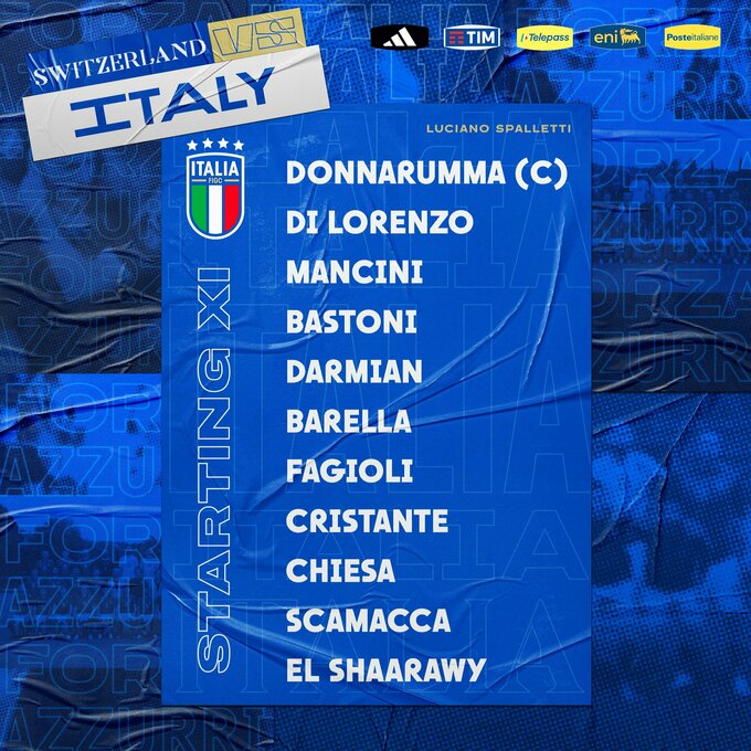 Италия: Доннарумма, Ди Лоренцо, Манчини, Бастони, Дармиан, Барелла, Фаджоли, Кристанте, Кьеза, Скамакка, Эль-Шаарави.