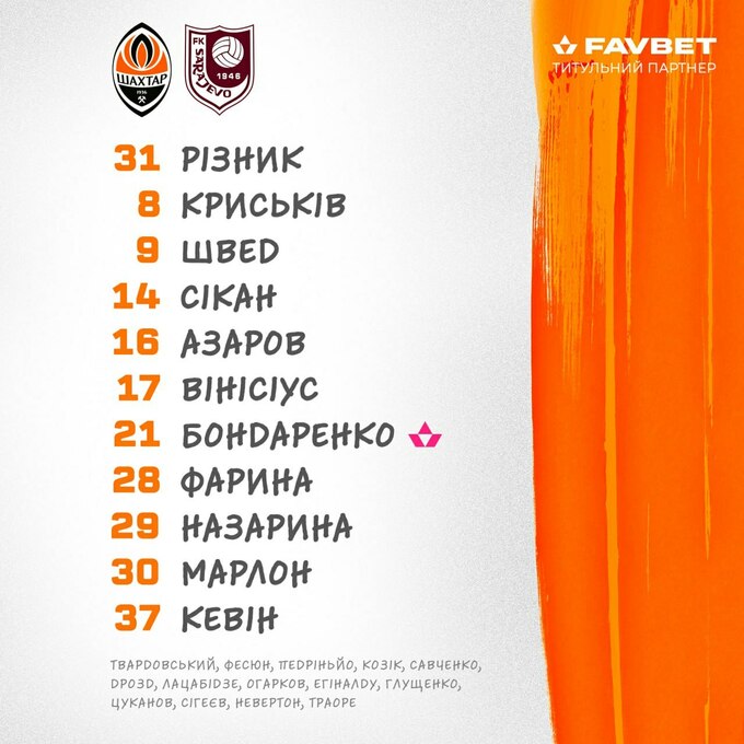 Стартовый состав «Шахтера»: Ризнык, Крыськив, Швед, Сикан, Азаров, Винисиус, Бондаренко, Фарина, Назарина, Марлон, Кевин.