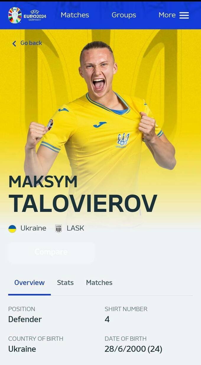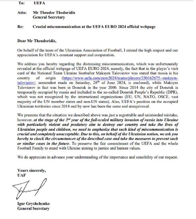 «Обращаемся к вам по поводу досадной ошибки, которая, к сожалению, была обнаружена на официальной странице УЕФА Евро-2024, а именно того факта, что в визитке футболиста сборной Украины Максима Таловерова указано, что страной его рождения является россия, хотя на самом деле Максим Таловеров родился в Донецке в 2000 году.