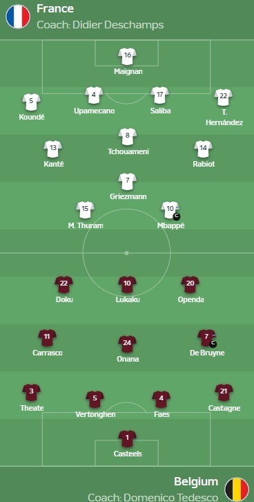 Франция: Меньян, Тео Эрнандес, Салиба, Упамекано, Кунде, Рабьо, Канте, Тчуамени, Гризманн, Мбаппе, Тюрам