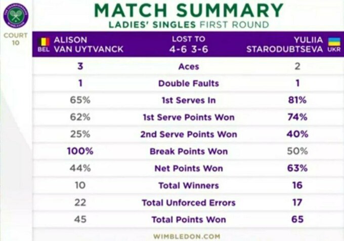 Алисон ван Эйтванк (Бельгия) – Юлия Стародубцева (Украина) [Q] – 4:6, 3:6