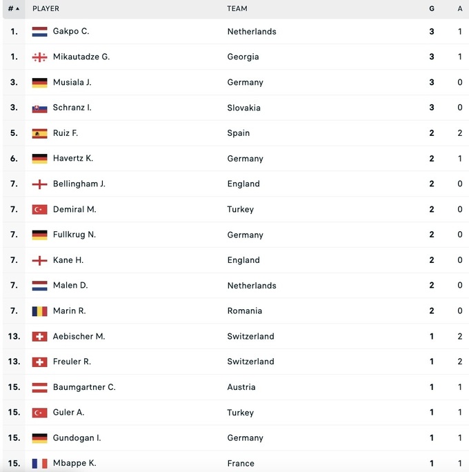 В списке лучших бомбардиров турнира нет единоличного лидера. Сразу по три гола забили Коди Гакпо (Нидерланды), Жорж Микаутадзе (Грузия), Джамал Мусиала (Германия), Иван Шранц (Словакия). Однако Микаутадзе и Шранц больше не смогут улучшить свои показатели, поскольку их сборные вылетели из турнира.