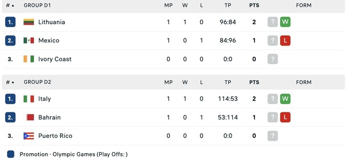 Сборная Италия поиздевалась над Бахрейном, выиграв в 61 очко, Литва одержала убедительную победу над Мексикой.