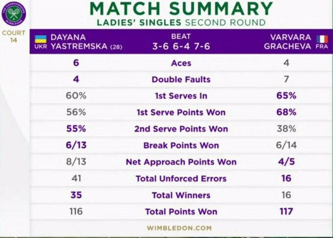 Ястремская стала первой представительницей Украины, которой удалось выйти в 1/16 финала Уимблдонского турнира. Ранее соревнования покинула Юлия Стародубцева, которая не сумела преодолеть 2-й раунд.