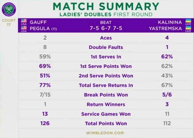 Коко Гофф (США) / Джессика Пегула (США) – Ангелина Калинина (Украина) / Даяна Ястремская (Украина) – 7:5, 6:7 (7:9), 7:5