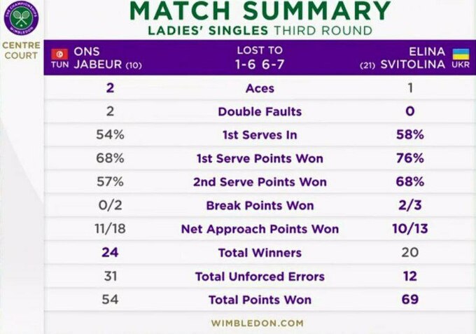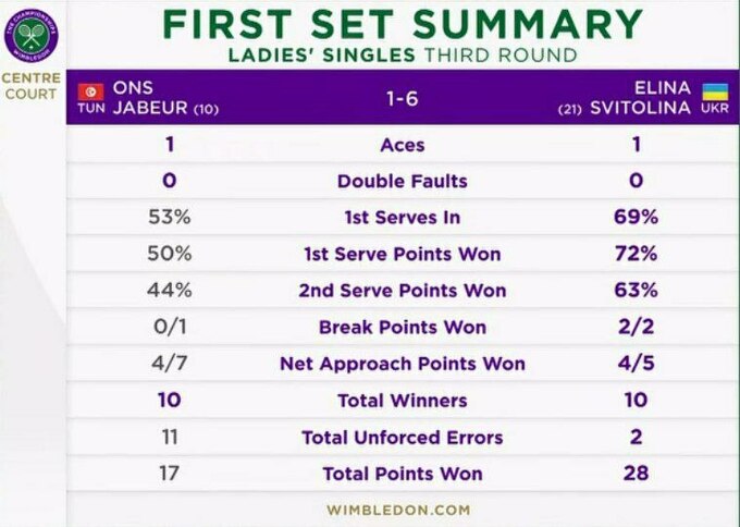 Elina Svitolina produces a brilliant performance to beat two-time finalist Ons Jabeur 6-1, 7-6(4)#Wimbledon pic.twitter.com/uu1kUkJVwN