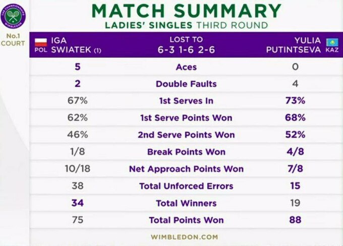 Phenomenal Putintseva 😲@PutintsevaYulia upsets world No.1 Iga Swiatek 3-6, 6-1, 6-2 in a stunning performance to advance to the fourth round! 👏#Wimbledon pic.twitter.com/lUquT4mBDH