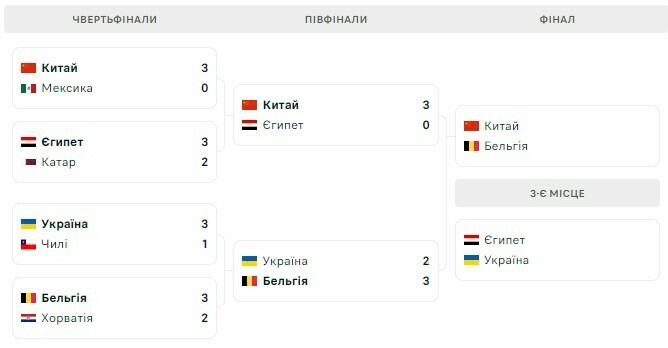 В 1/4 финала Украина обыграла Чили (3:1), а в полуфинале проиграла Бельгии (2:3).