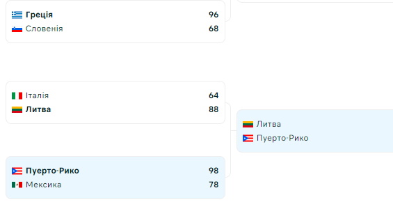 Завершились два матча квалификации на Олимпийские игры среди баскетбольных сборных. Италия уступила Литве со счетом 64:88, а сборная Мексики проиграла Пуэрто-Рико со счетом 78:98.
