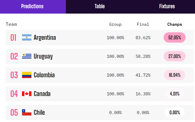 Самые высокие шансы на победу у сборной Аргентины. Вероятность успеха действующих чемпионов мира – 52,05%.