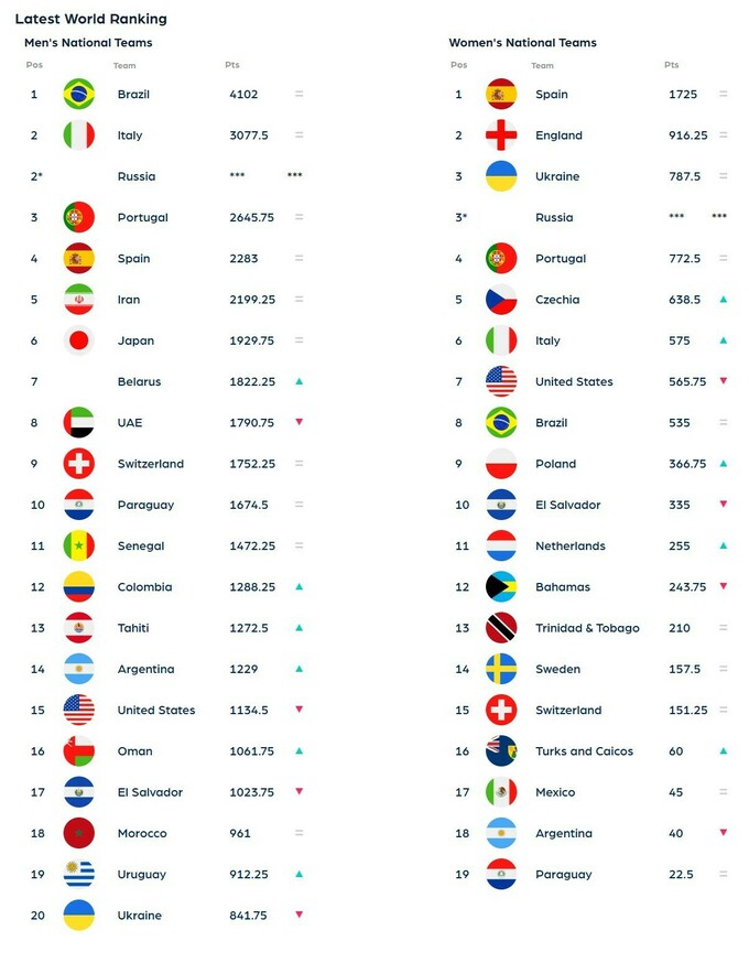 Всемирная организация пляжного футбола (BSWW) обновила рейтинг мужских и женских сборных по бичсокеру.