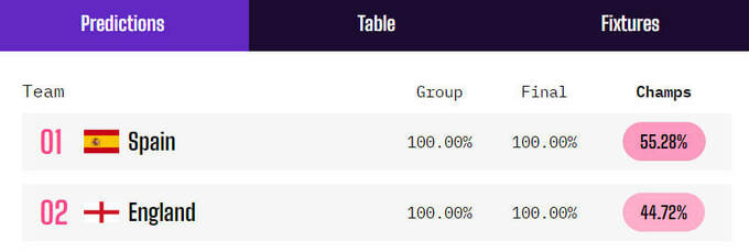 С учетом дополнительного времени и пенальти, как возможных способов определения чемпиона, Испания выигрывает финал в 60,4% симуляций, а Англия поднимает трофей в остальных 39,6%».