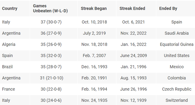 Второе место в этом топе занимает Аргентина – 36 игр. Интересно, что Месси и компания были в шаге от повторения рекорда итальянцев (и, как оказалось позже, могли и перебить его), но проиграли в первом туре группового этапа ЧМ-2022 Саудовской Аравии, а затем выиграли все встречи и завоевали титул.