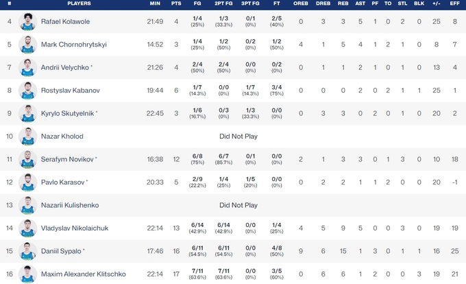 Украина: Сипало 16+15 подборов, Новиков 12+3 передачи, Карасев 5, Величко 4, Скутельник 3 — старт, Кличко 17+6 подборов + 3 блок-шота, Николайчук 13+9 подборов + 5 передач, Кабанов 6, Колаволе + 5 подборов, Черногрицкий 3 + 5 подборов + 4 передачи
