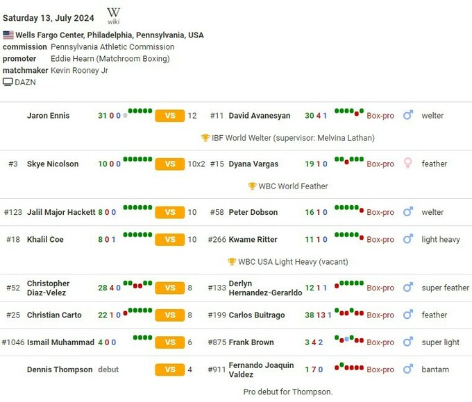 На ринг выйдут американец Джарон Эннис (31–0, 28 KO) и Давид Аванесян из Армении (30–4–1, 18 KO).