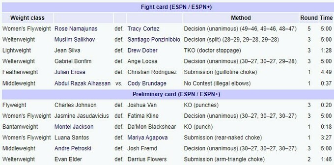 В главном бою встретились американки Роуз Намаюнас (12–6) и Трэйси Кортес (11–1).