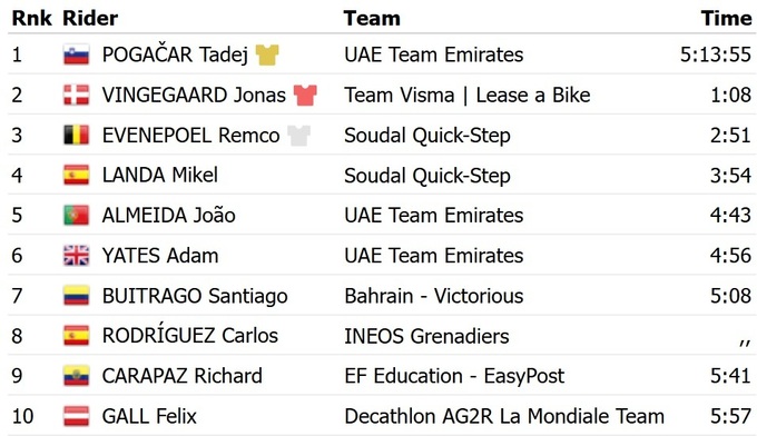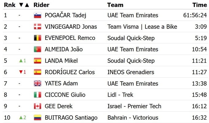 На пиренейском этапе с финишем подъеме Плато де Бейль Погачар на 1 минуту и 8 секунд опередил датчанина Йонаса Вингегора из «Visma Lease a Bike». В общем зачете преимущество словенца уже превышает три минуты.