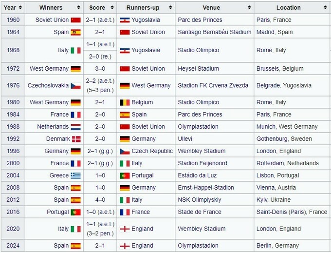 Испания в 4-й раз стала победителем ЧЕ (1964, 2008, 2012) – и это рекорд – плюс один раз финалистом (1984).
