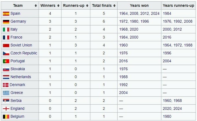 Испания завоевала 4-й трофей на Евро. У кого сколько титулов?