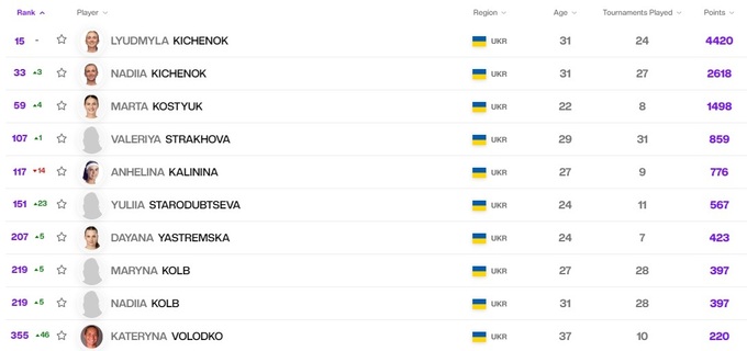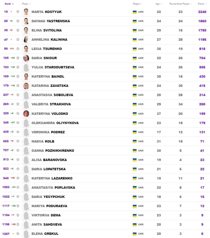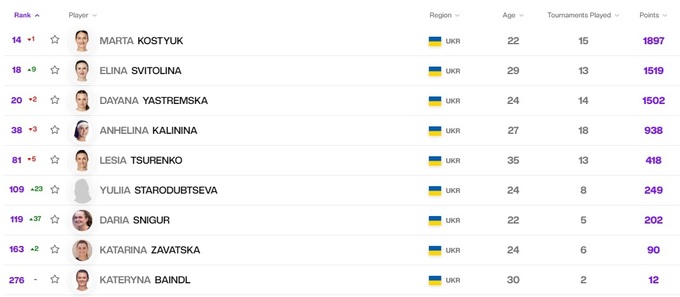 Первая ракетка Украины Марта Костюк сохранила 19-ю строчку, Элина Свитолина опустилась на 9 мест, но осталась в топ-30, Даяна Ястремская улучшила свое положение – 25-е место. Ангелина Калинина сохранила место в топ-50, Леся Цуренко опустилась ближе к концу первой сотни. Солидно добавили Дарья Снигур, Юлия Стародубцева, Катерина Байндл и Катарина Завацкая.