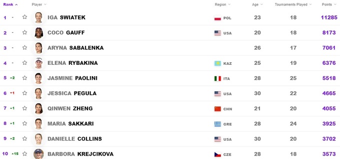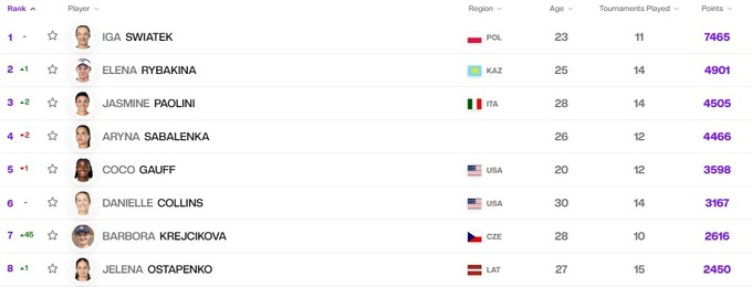 Элина Свитолина в Чемпионской гонке поднялась в топ-20, Марта Костюк потеряла одну позицию. Также немного опустились Даяна Ястремская, Ангелина Калинина и Леся Цуренко. Юлия Стародубцева, Дарья Снигур и Катарина Завацкая – в «плюсе».