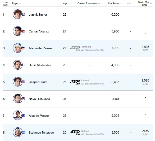 В Чемпионский гонке Алькарас вышел на вторую позицию, Медведев обошел Рууда, Джокович ворвался в топ-8, Рублев опустился на 12-е место.