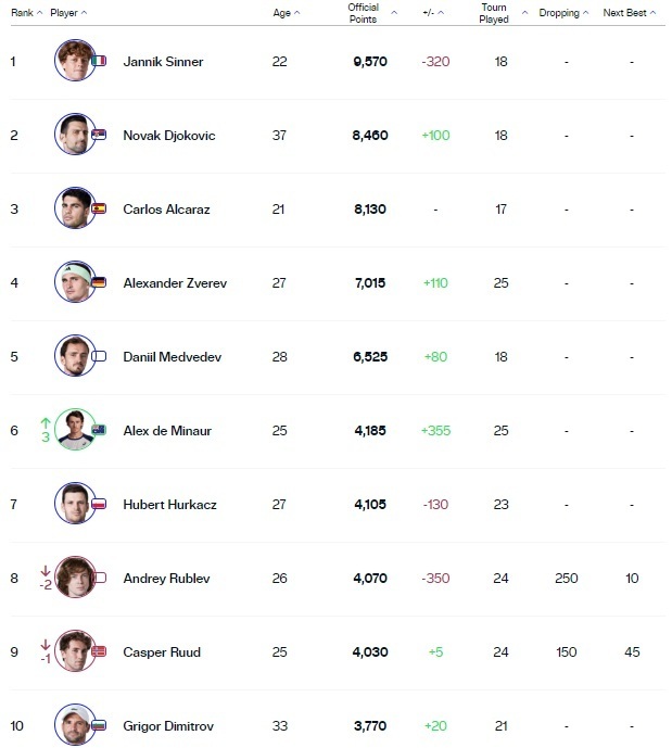 После завершения Уимблдонского турнира лидер мирового рейтинга Янник Синнер сохранил первую позицию. Новак Джокович и Карлос Алькарас также остались на своих местах.