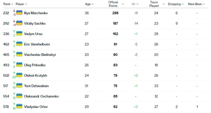 Десять лучших украинцев в рейтинге ATP