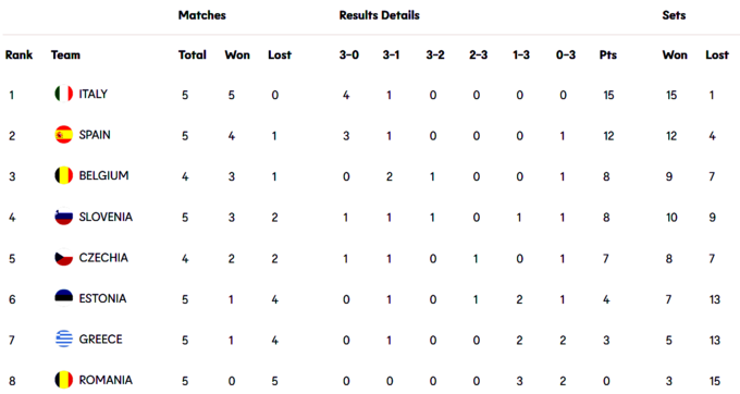 В группе 2 впереди сборная Италии (5 побед в 5 матчах и 15 очков). На втором месте испанские волейболисты (5 матчей, 4 победы, 12 очков).