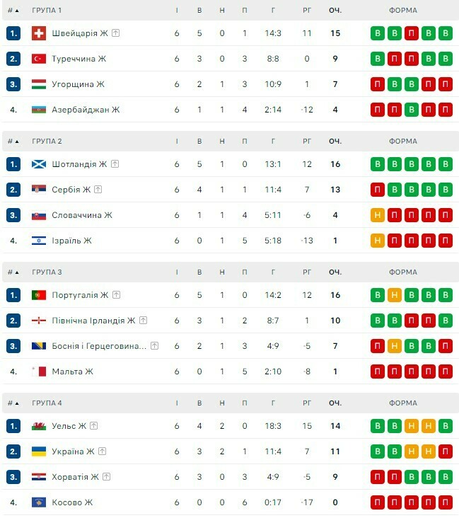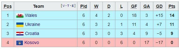 Сборная Украины заняла 2-е место (11 очков) и вышла в плей-офф квалификации Евро-2025. Впереди в группе: Уэльс (14), далее следуют Хорватия (9), Косово (0).