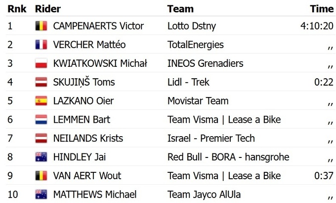 Для Кампенартса это первая в карьере победа на этапах Тур де Франс. Желтую майку лидера общего зачета сохранил словенец Тадей Погачар из «UAE Emirates».