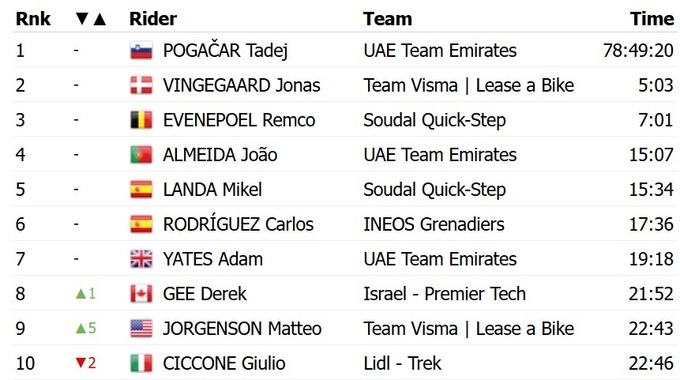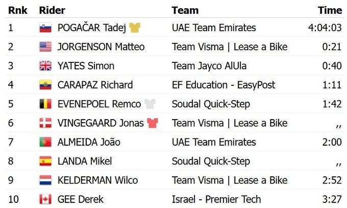 Главные конкуренты Погачара по общему зачету, Йонас Вингегор и Ремко Эвенпул, проиграли словенцу 1 минуту и 42 секунды.