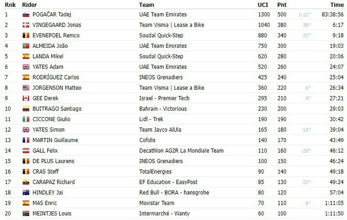 Последний 21-й этап – индивидуальную гонку на 33,7 км с раздельным стартом выиграл также Погачар, опередив Вингегора (+1:03) и Эвенпула (+1:14).