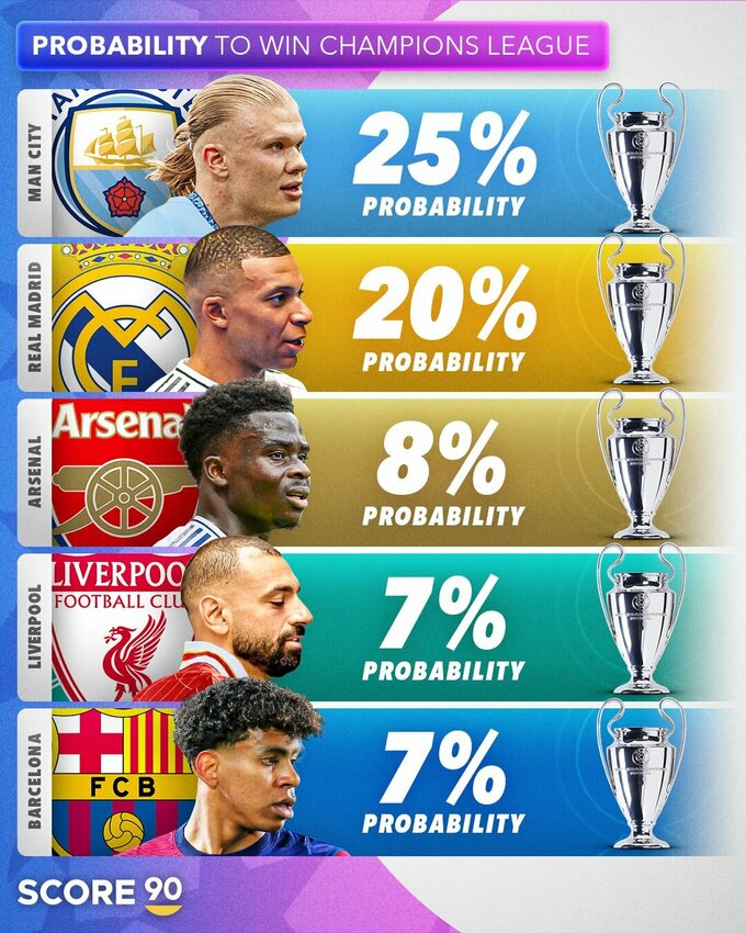 Авторитетный портал Score 90 обнародовал шансы футбольных клубов на победу в Лиге чемпионов 2024/25.