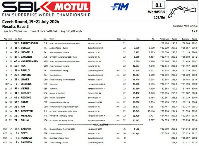 Лидер заводской команды BMW Топрак Разгатлыолу выиграл вторую гонку Раунда Чехии на трассе «Мост». Однако четвертого каре подряд у турецкого райдера не вышло – он стартовал с поула, но пропустил Николо Булегу из заводской команды Дукати. Через четыре круга Топрак лидерство вернул и довел гонку до своей победы.