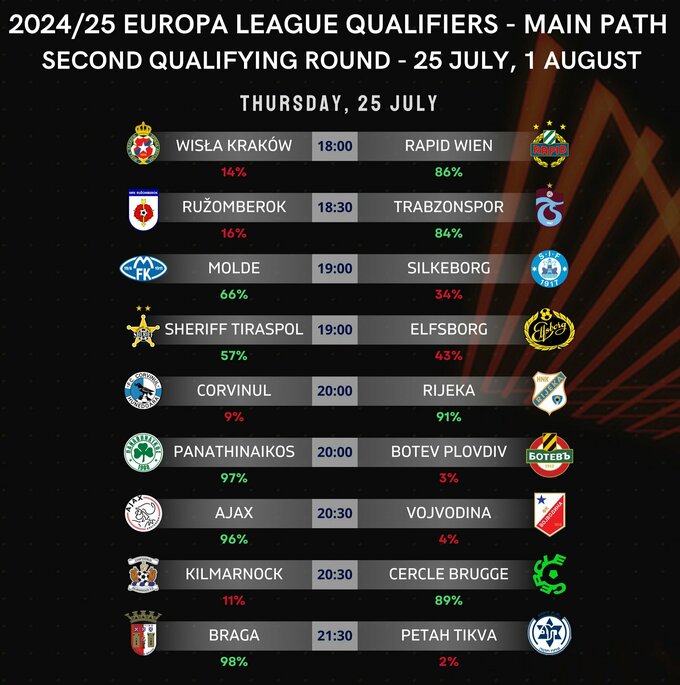 🔹 Победитель: Ружомберок (Словакия) / Трабзонспор (Турция) – Победитель: Висла Краков (Польша) / Рапид Вена (Австрия)