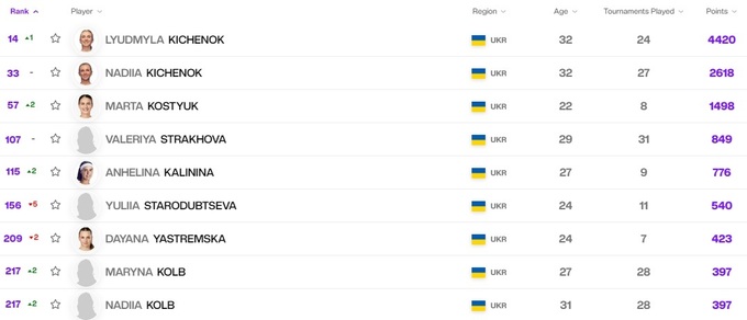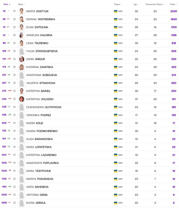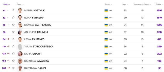 Марта Костюк сохранила место в топ-20, Даяна Ястремская и Элина Свитолина оказались на одну строчку ниже. Небольшой прогресс у Леси Цуренко, Катарины Завацкой и Анастасии Соболевой. Дарья Снигур не смогла защитить очки за победу на 100-тысячнике ITF и опустила на 26 мест, шесть строчек потеряла и Юлия Стародубцева, в конец третьей сотни улетела Катерина Байндл.