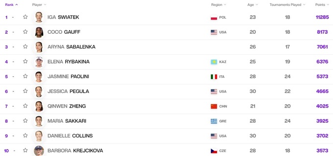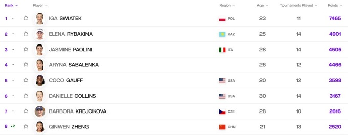 В Чемпионской гонке Чжэн Циньвень поднялась на восьмое место, потеснив Алену Остапенко.