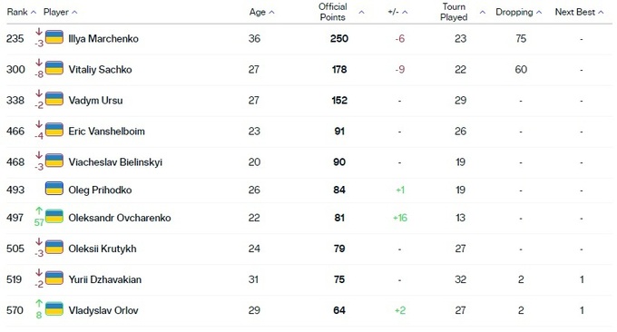 Лучшие из украинских теннисистов потеряли по несколько позиций в рейтинге. Солидно поднялся Александр Овчаренко, которому дошли очки за финал на 25-тысячнике ITF в Италии.