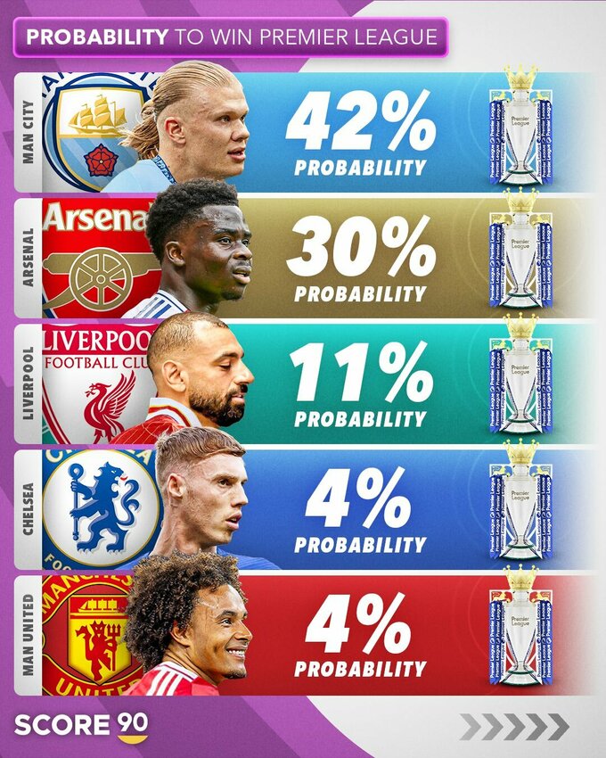 Авторитетный портал Score 90 обнародовал шансы футбольных клубов на победу в Английской Премьер-лиге 2024/25.