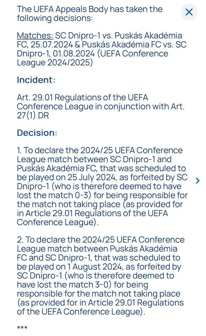 - Объявить матч Лиги конференций УЕФА 2024/25 между «Академией Пушкаша» и СК «Днепр-1», который был запланирован на 1 августа 2024 года, как несостоявшийся по вине СК «Днепр-1» (который, таким образом, считается проигравшим матч со счетом 0:3) за то, что он несет ответственность за непроведение матча (как предусмотрено статьей 29.01 Регламента Лиги конференций УЕФА).