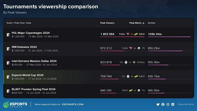 На первом месте расположился финал Мажора в Копенгагене, где NaVi обыграли FaZe. В пиковый момент за трансляцией матча следили 1 853 954 зрителя.
